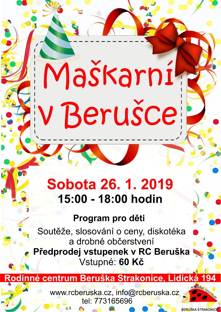 Maškarní karneval s programem pro děti se v Berušce uskuteční v sobotu 26.1.2019 od 15 hod. Připraveny budou soutěže, slosování o ceny, diskotéka a drobné občerstvení. Předprodej vstupenek v rodinném centru, omezený počet míst. Vstupné: 60 Kč.