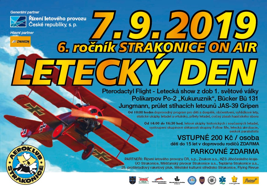 Letecký den Strakonice ON AIR ,který proběhne v sobotu 7.9.2019 od 10:00 hodin na letišti Strakonice a jehož pořadatelem je Aeroklub Strakonice .Tento letecký den je již šestým ročníkem.