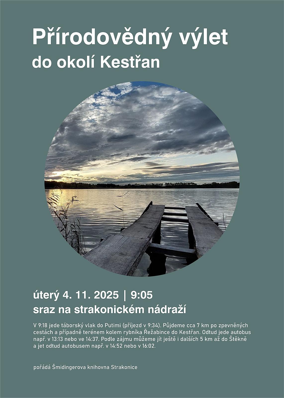 Půjdeme cca 7 km po zpevněných cestách a případně terénem kolem rybníka Řežabince do Kestřan.