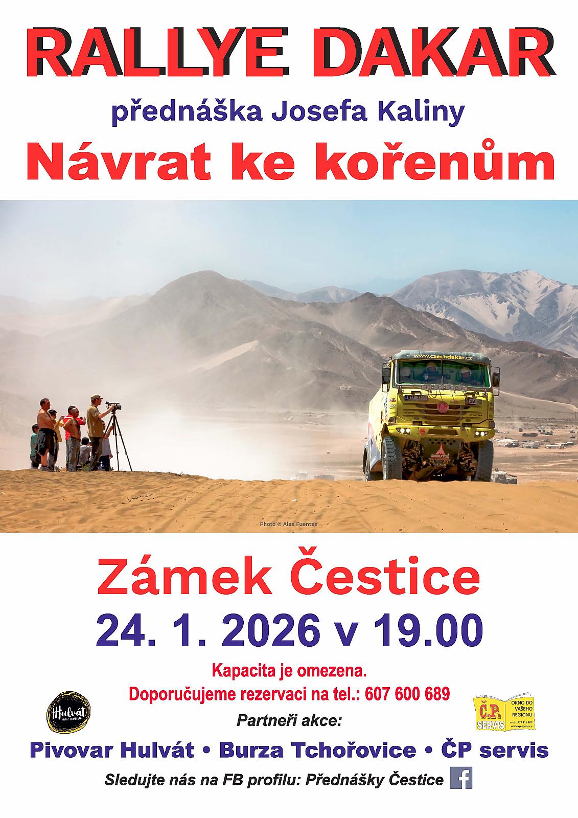 Dovolujeme si Vás pozvat na přednášku Josefa Kaliny na téma Rallye Dakar. Přednáška se koná v sobotu 24.1.2026 v Česticích čp.1 (zámek) od 19:00h Občerstvení a velkoplošná projekce zajištěna! Vzhledem k omezené kapacitě doporučujeme rezervaci na tel.607600689 Během přednášky je možnost koupě medu od domácího včelaře.