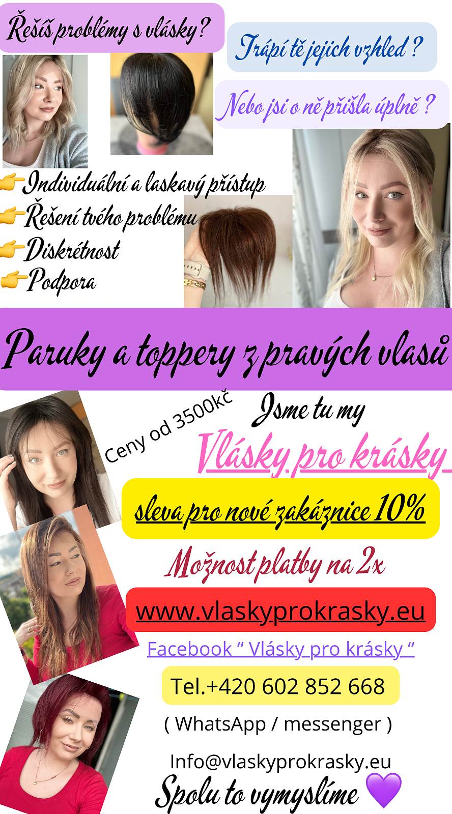 Vhodné při alopecii, řídnutí vlasů nebo jen pro změnu vzhledu. Přirozený vzhled, individuální přístup, možnost úprav na míru.